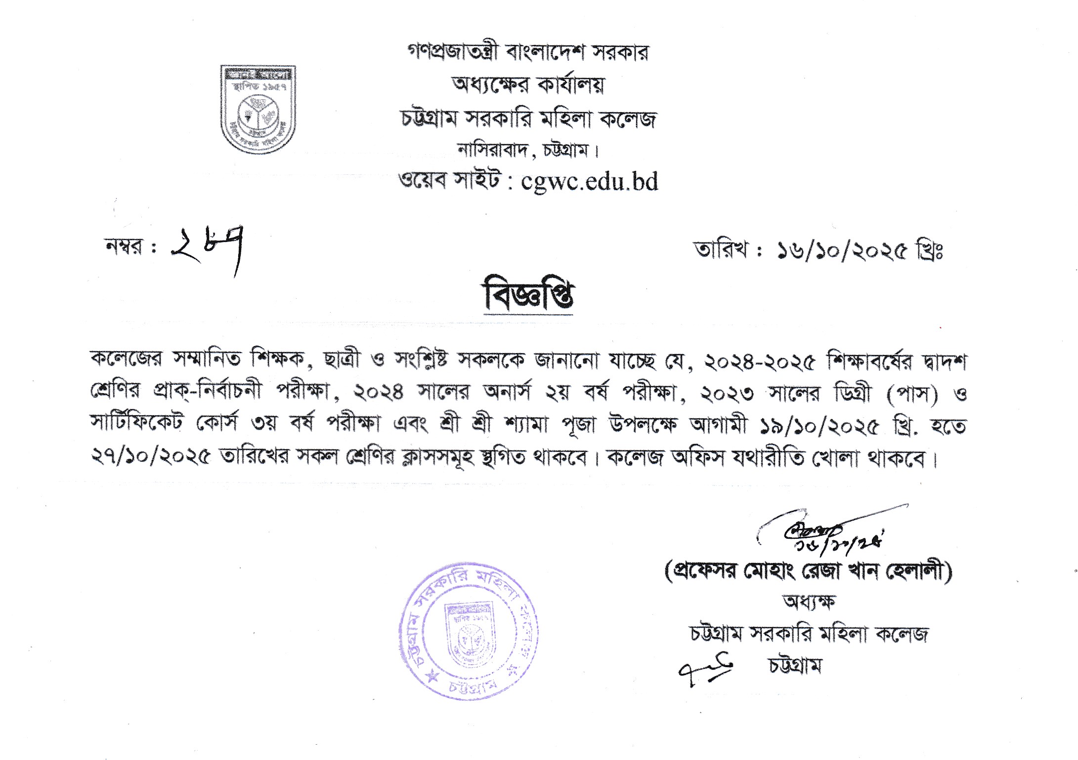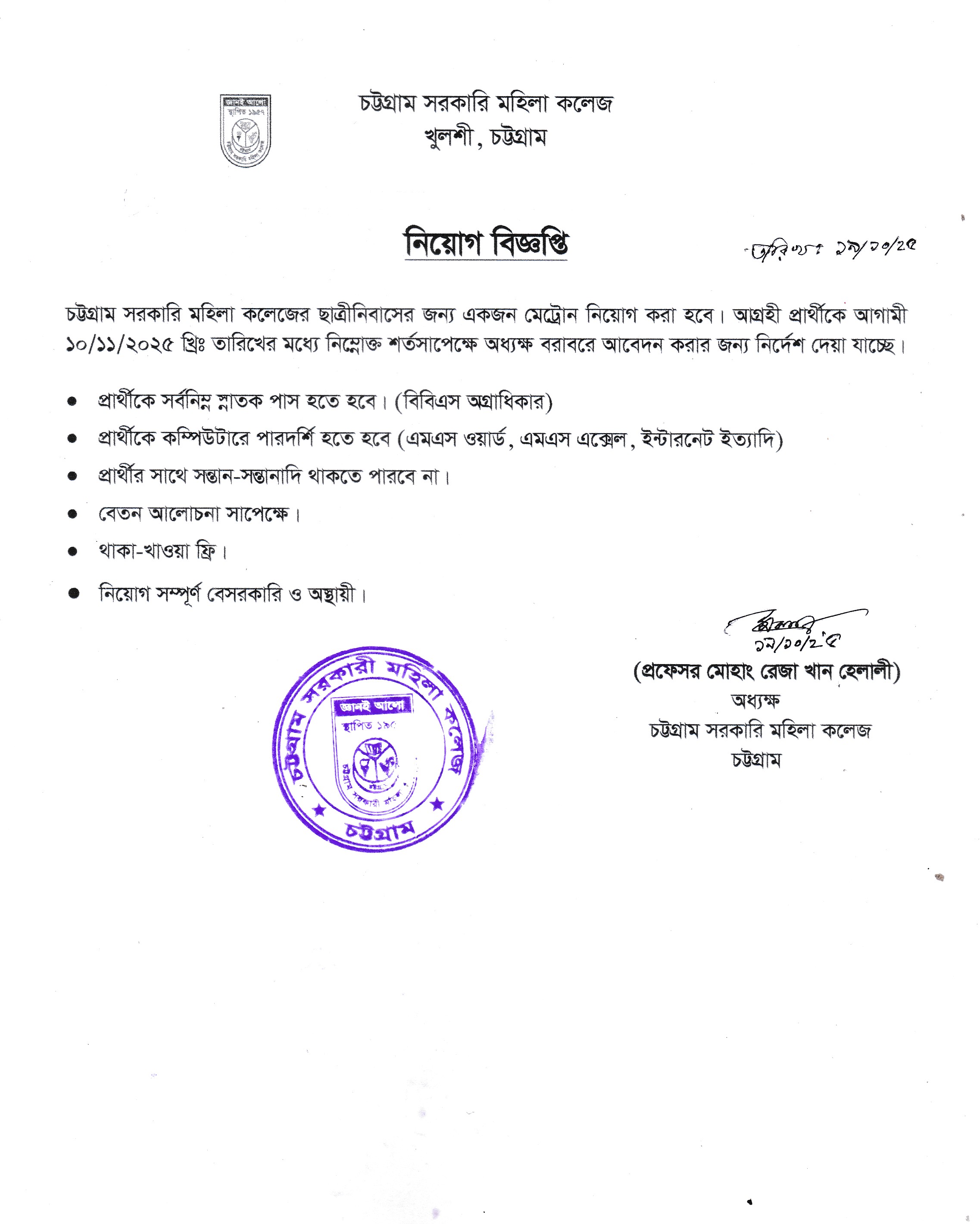 চট্টগ্রাম সরকারি মহিলা কলেজের ছাত্রীনিবাসের জন্য মেট্রোন নিয়োগ সংক্রান্ত বিজ্ঞপ্তি