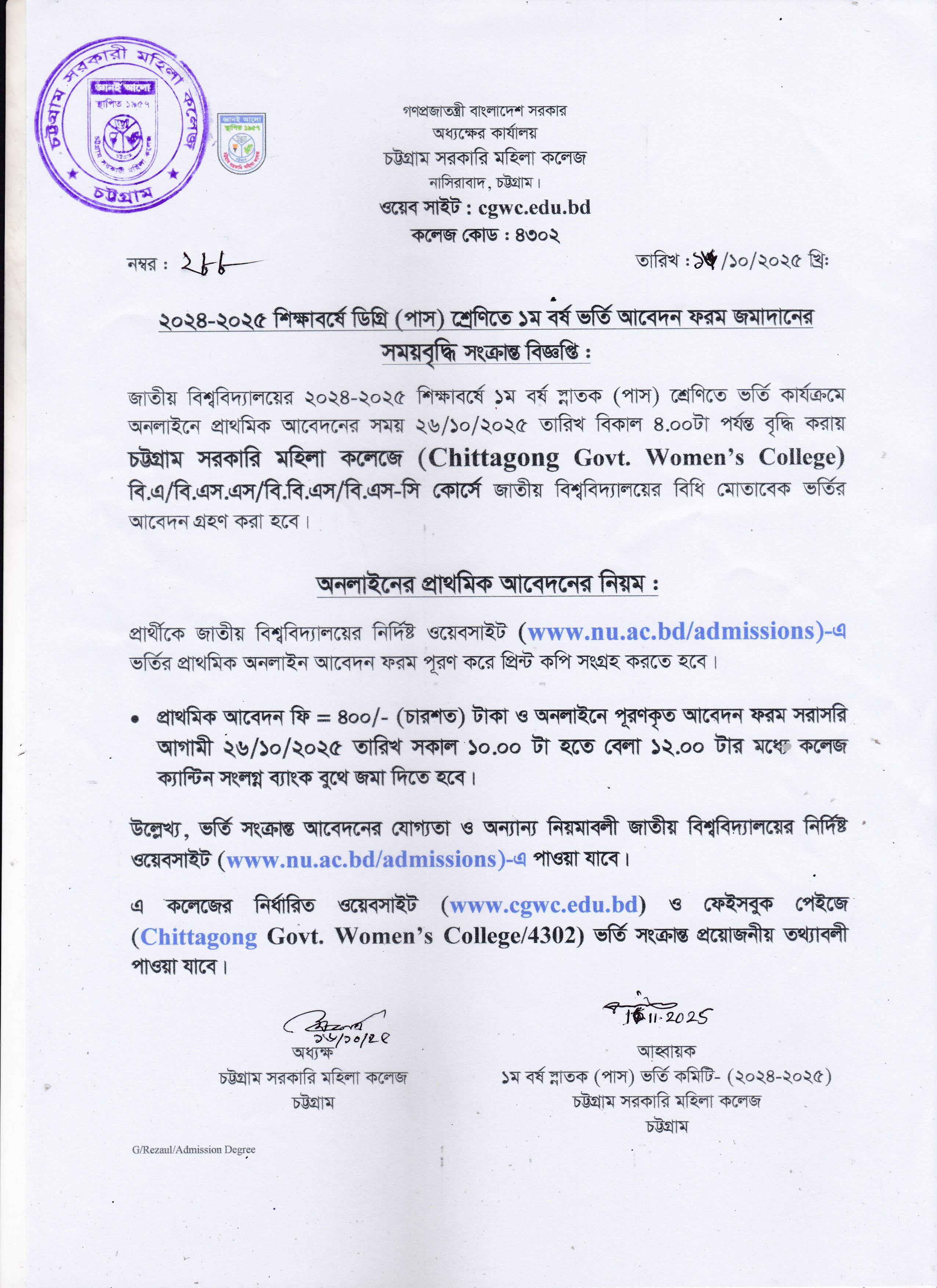 ২০২৪-২০২৫ শিক্ষাবর্ষে স্নাতক (পাস) ১ম বর্ষে ভর্তির প্রাথমিক আবেদন এর সময় বৃদ্ধি সংক্রান্ত বিজ্ঞপ্তি