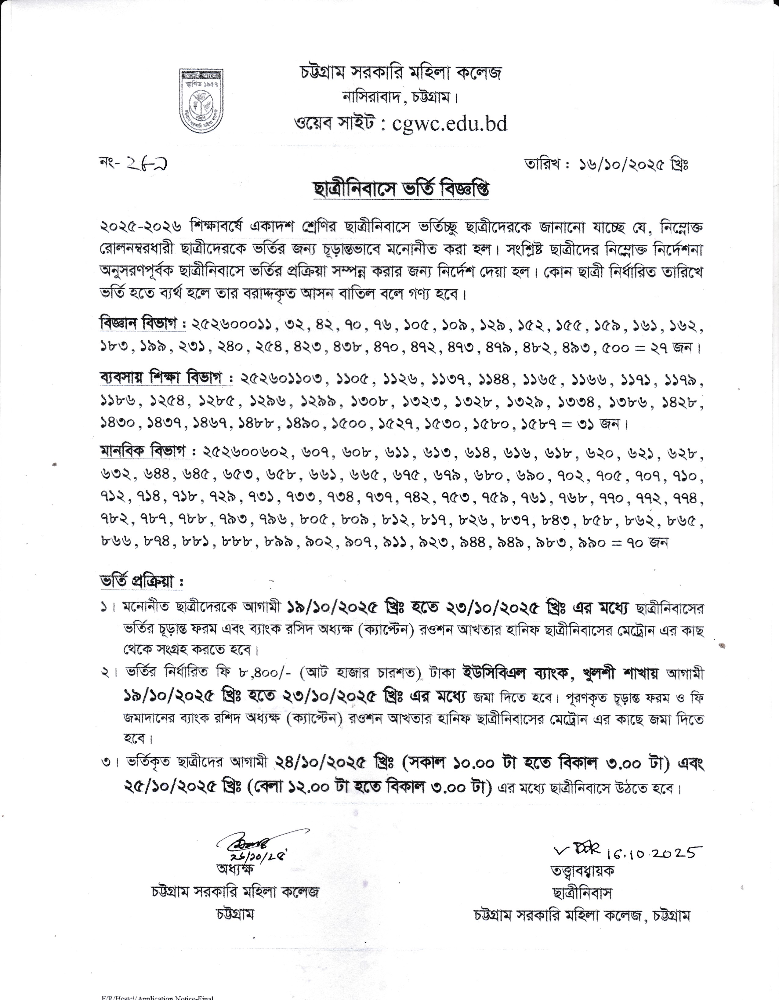 ২০২৫-২০২৬ শিক্ষাবর্ষে একাদশ শ্রেণির ছাত্রীনিবাসে ভর্তির ফলাফল প্রকাশ