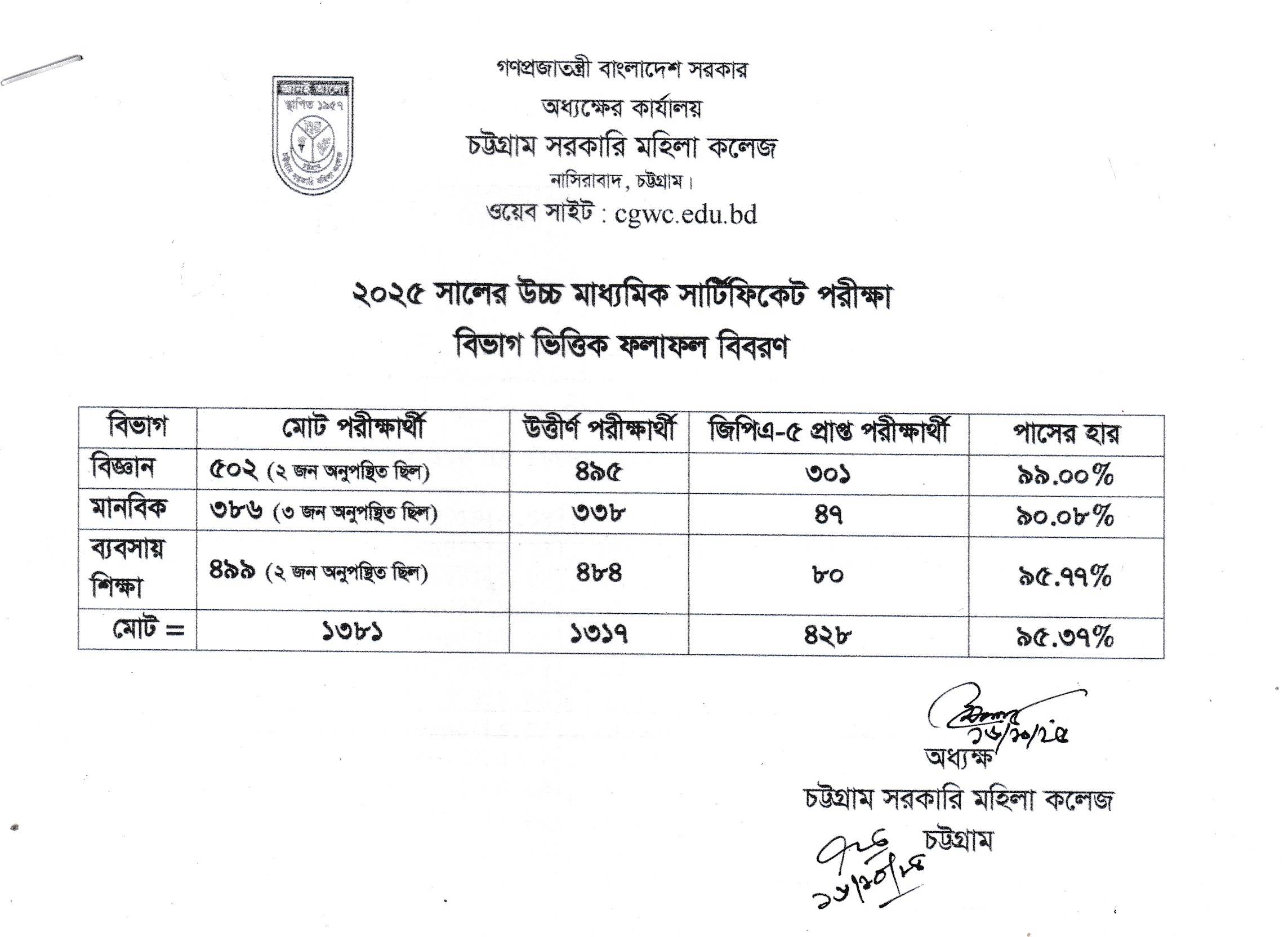চট্টগ্রাম সরকারি মহিলা কলেজের ২০২৫ সালের উচ্চ মাধ্যমিক সার্টিফিকেট পরীক্ষার ফলাফল বিবরণী