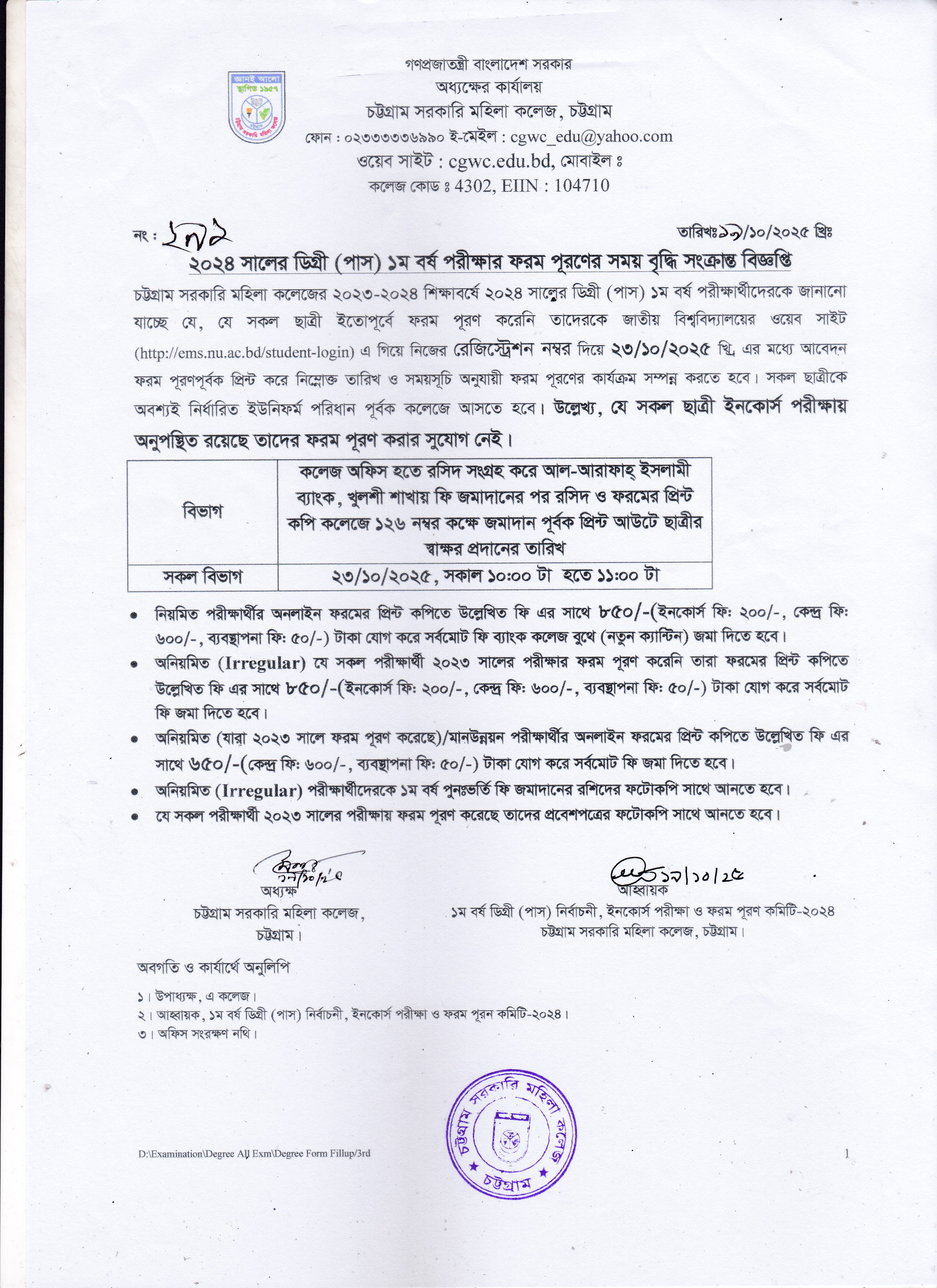 ২০২৪ সালের ডিগ্রি (পাস) ১ম বর্ষের ফরম পূরণের সময় বৃদ্ধি সংক্রান্ত বিজ্ঞপ্তি।