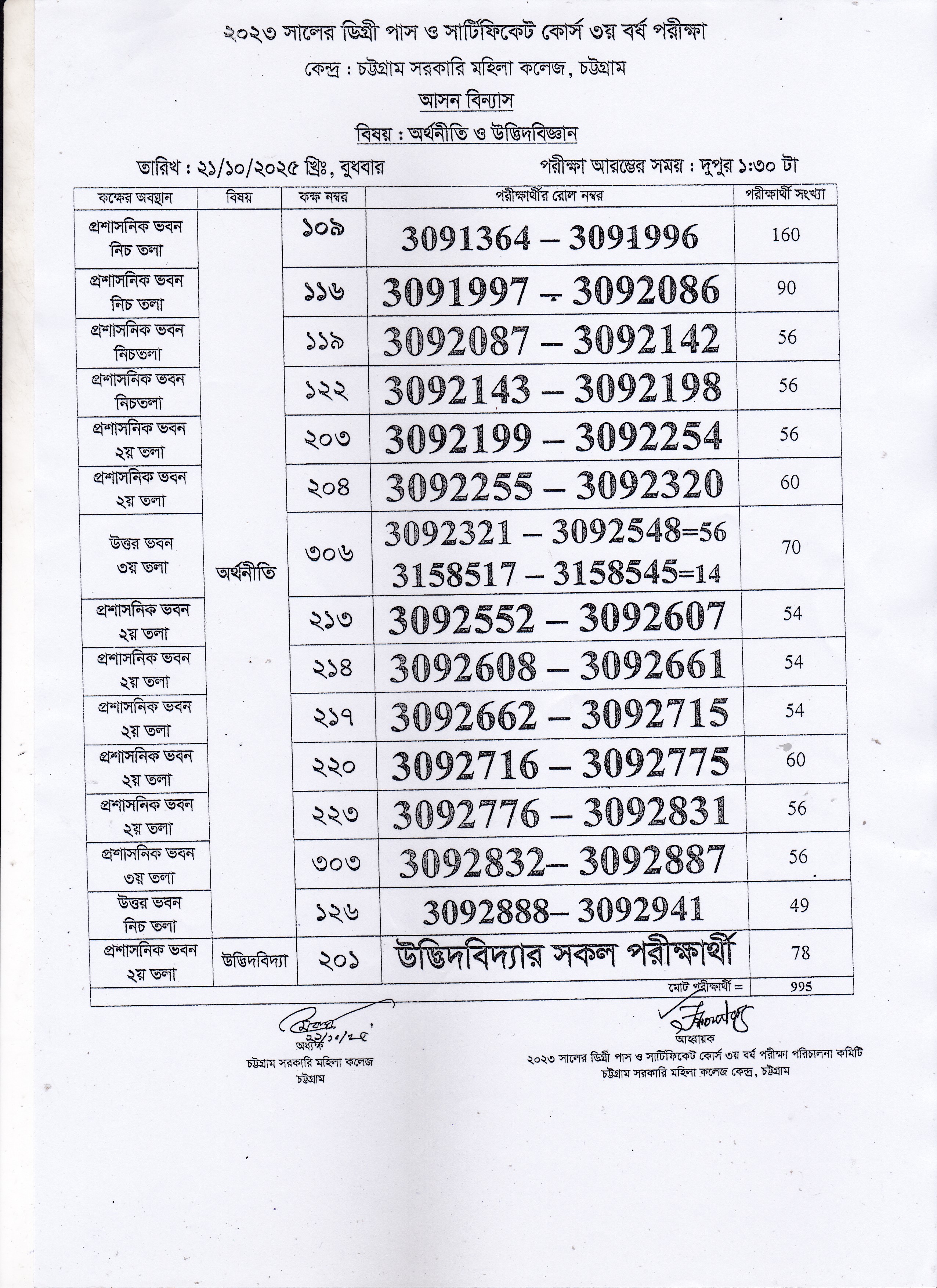 ২০২৩ সালের ডিগ্রি (পাস) ৩য় বর্ষ পরীক্ষার ২১/১০/২০২৫ তারিখের আসন বিন্যাস।