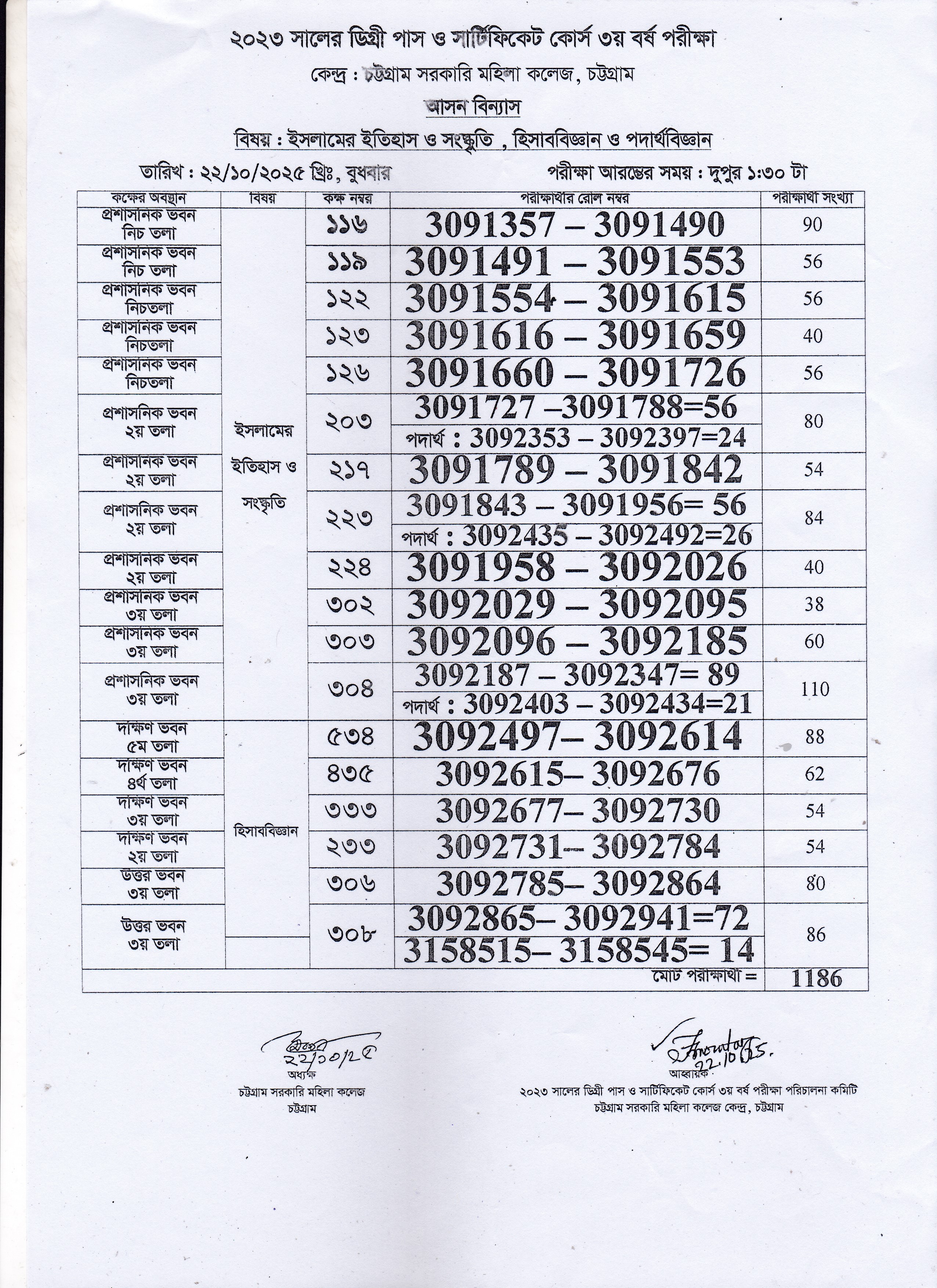 ২০২৩ সালের ডিগ্রি (পাস) ৩য় বর্ষ পরীক্ষার ২২/১০/২০২৫ তারিখের আসন বিন্যাস।