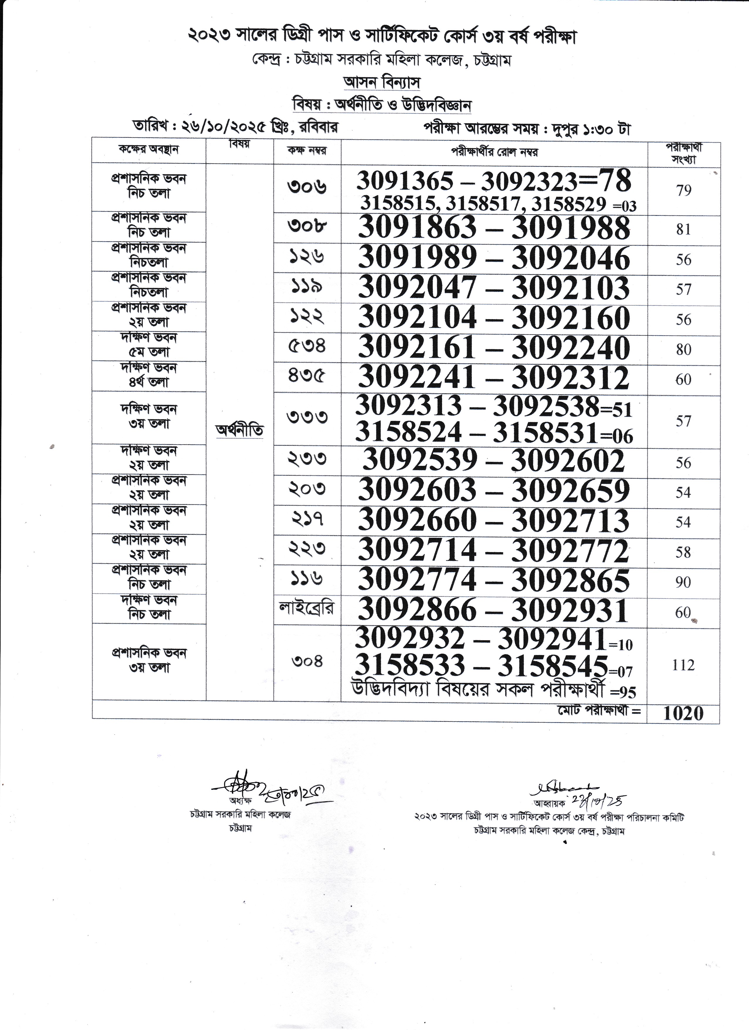 ২০২৩ সালের ডিগ্রি (পাস) ৩য় বর্ষ পরীক্ষার ২৬/১০/২০২৫ তারিখের আসন বিন্যাস।