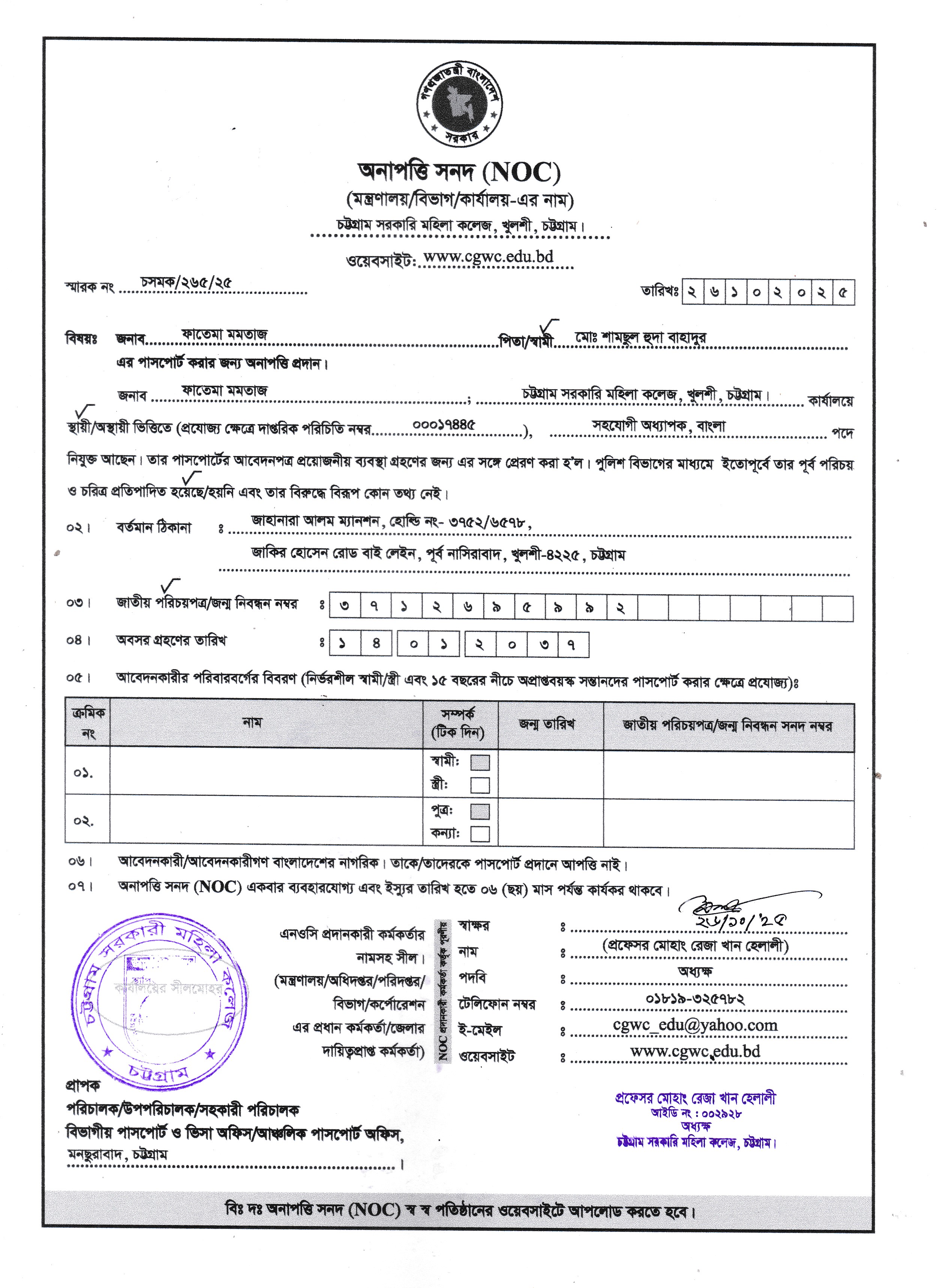 জনাব সায়মা আক্তার, সহকারী অধ্যাপক, রসায়ন, চট্টগ্রাম সরকারি মহিলা কলেজ, চট্টগ্রাম এর NOC ফরম