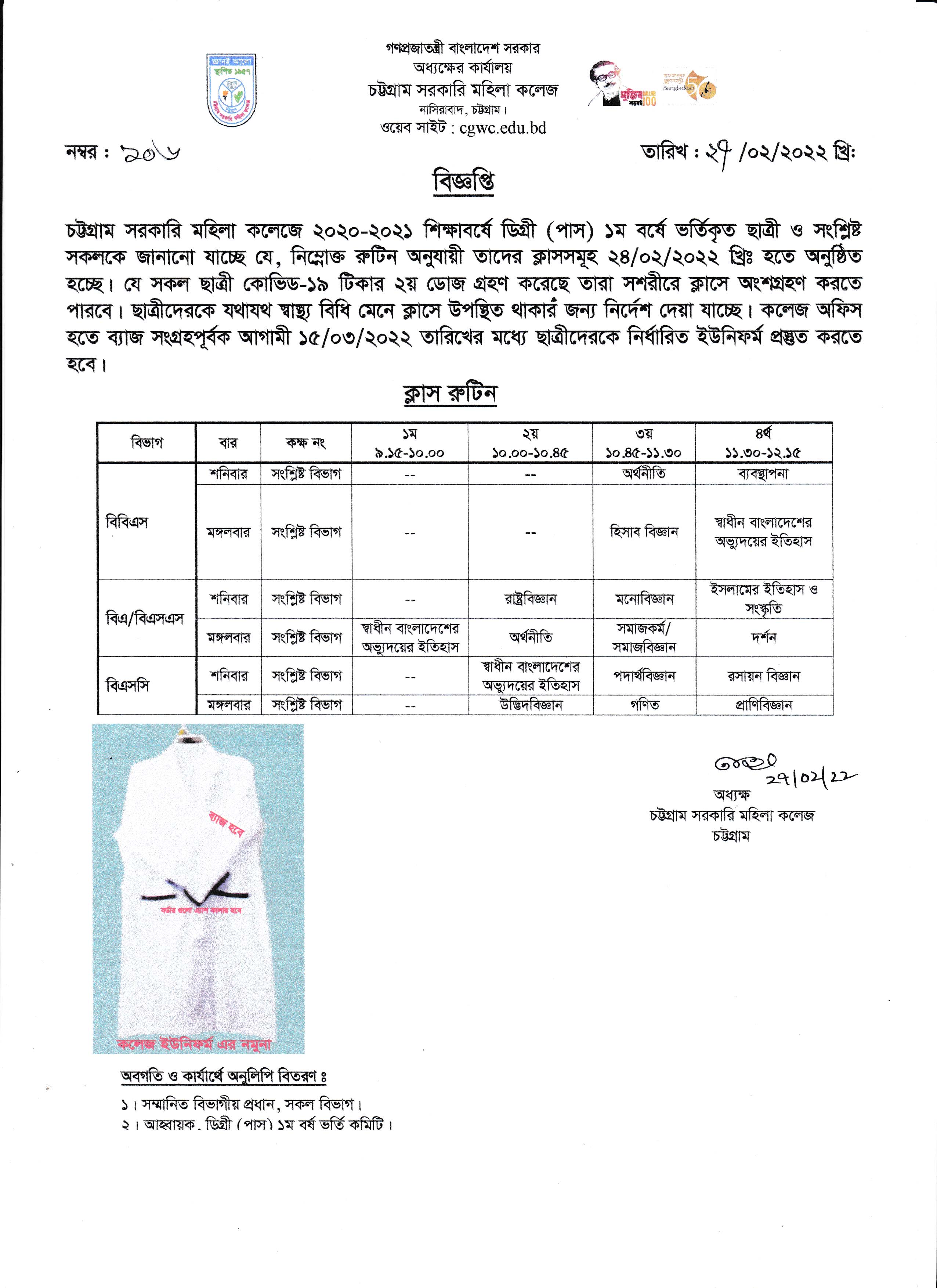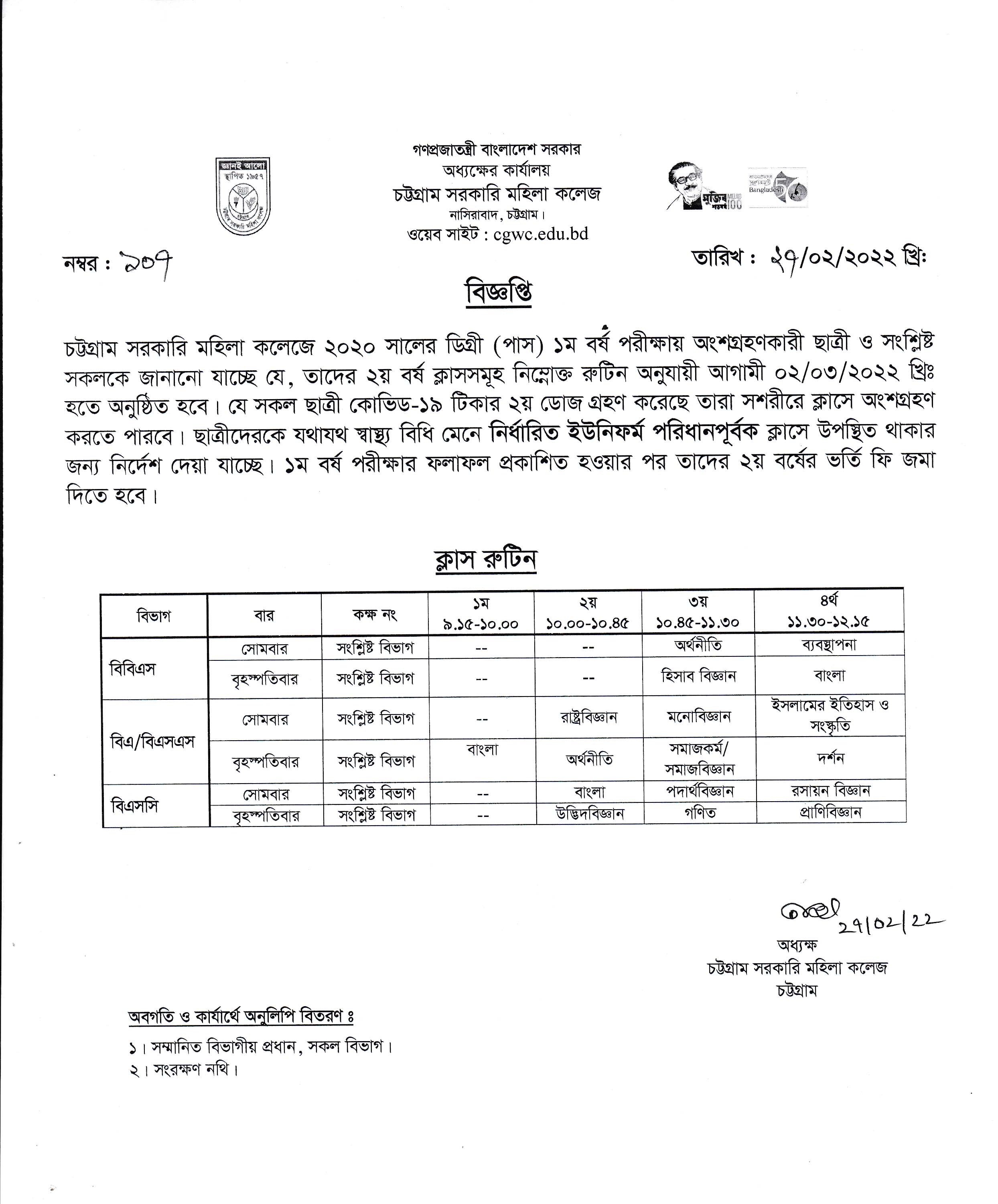 ২০২০ সালের ডিগ্রী (পাস) ১ম বর্ষ পরীক্ষায় অংশগ্রহণকারী ছাত্রীদের ২য় বর্ষের ক্লাস রুটিন সংক্রান্ত বিজ্ঞপ্তি প্রকাশ (২৭.০২.২০২২ খ্রিঃ)