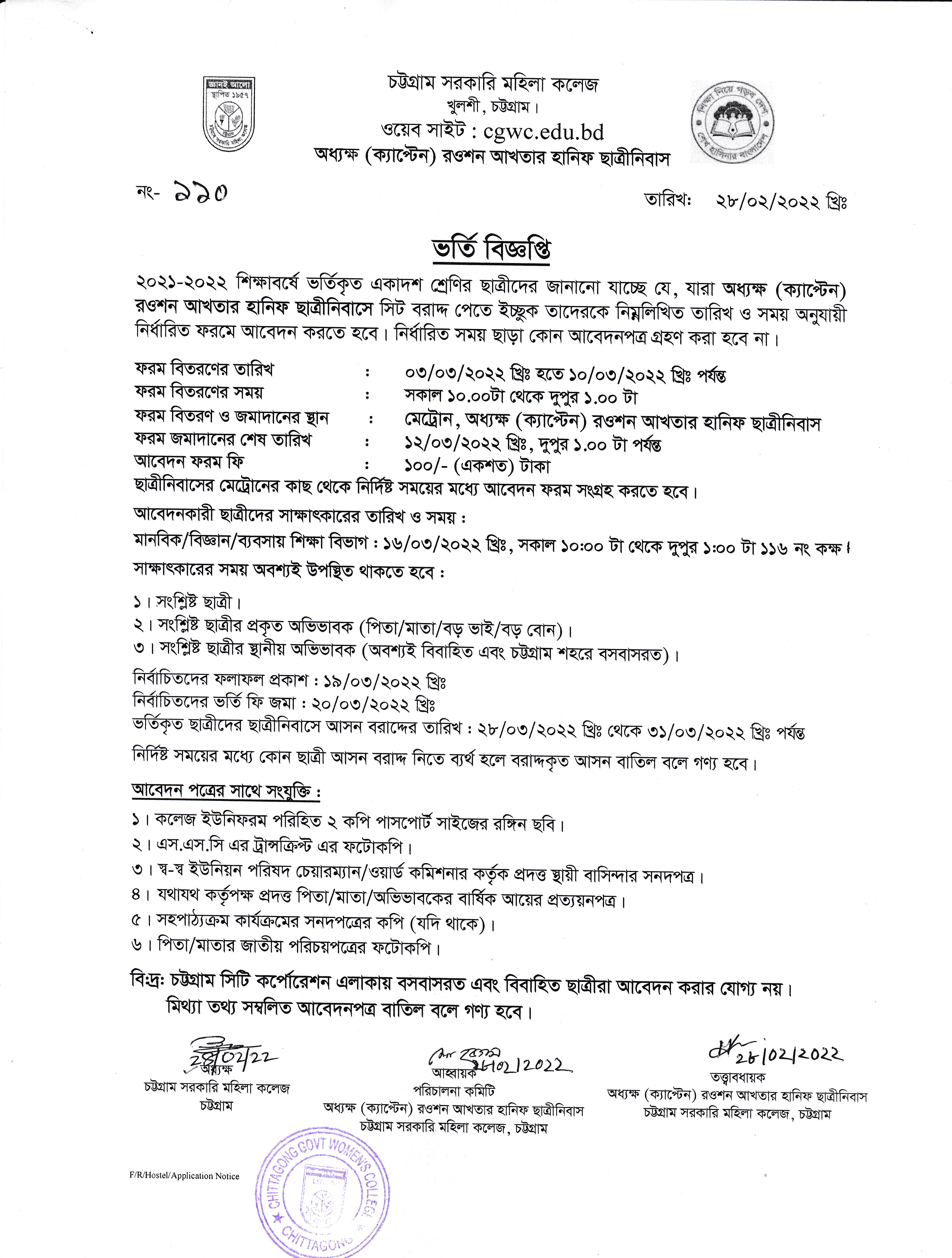 ২০২১-২০২২ শিক্ষাবর্ষে ভর্তিকৃত একাদশ শ্রেণির ছাত্রীদের জন্য অধ্যক্ষ (ক্যাপ্টেন) রওশন আখতার হানিফ ছাত্রীনিবাসের সিট বরাদ্দের বিজ্ঞপ্তি (২৮/০২/২০২২)