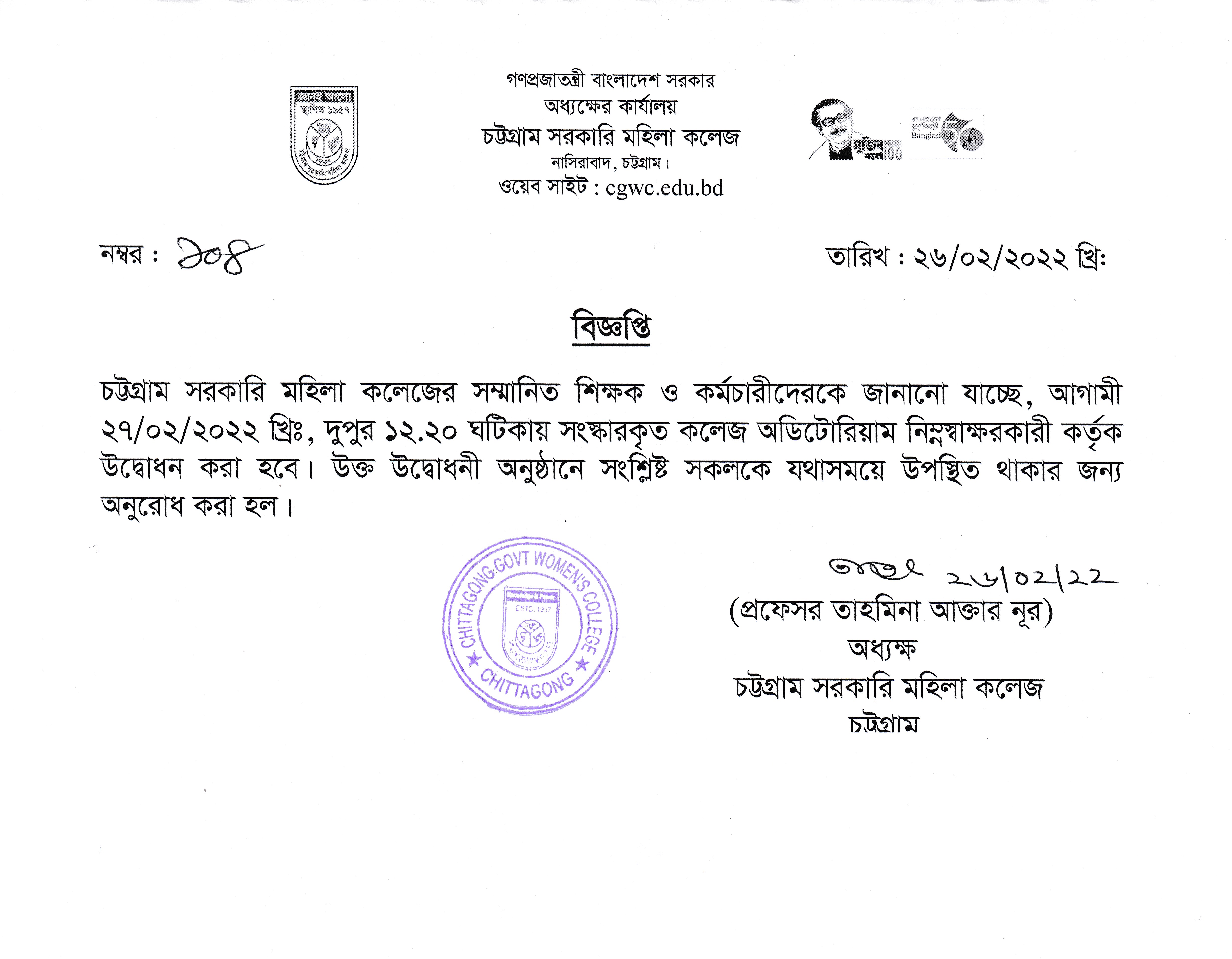 কলেজের অডিটোরিয়াম উদ্বোধন সংক্রান্ত বিজ্ঞপ্তি (২৬/০২/২০২২)