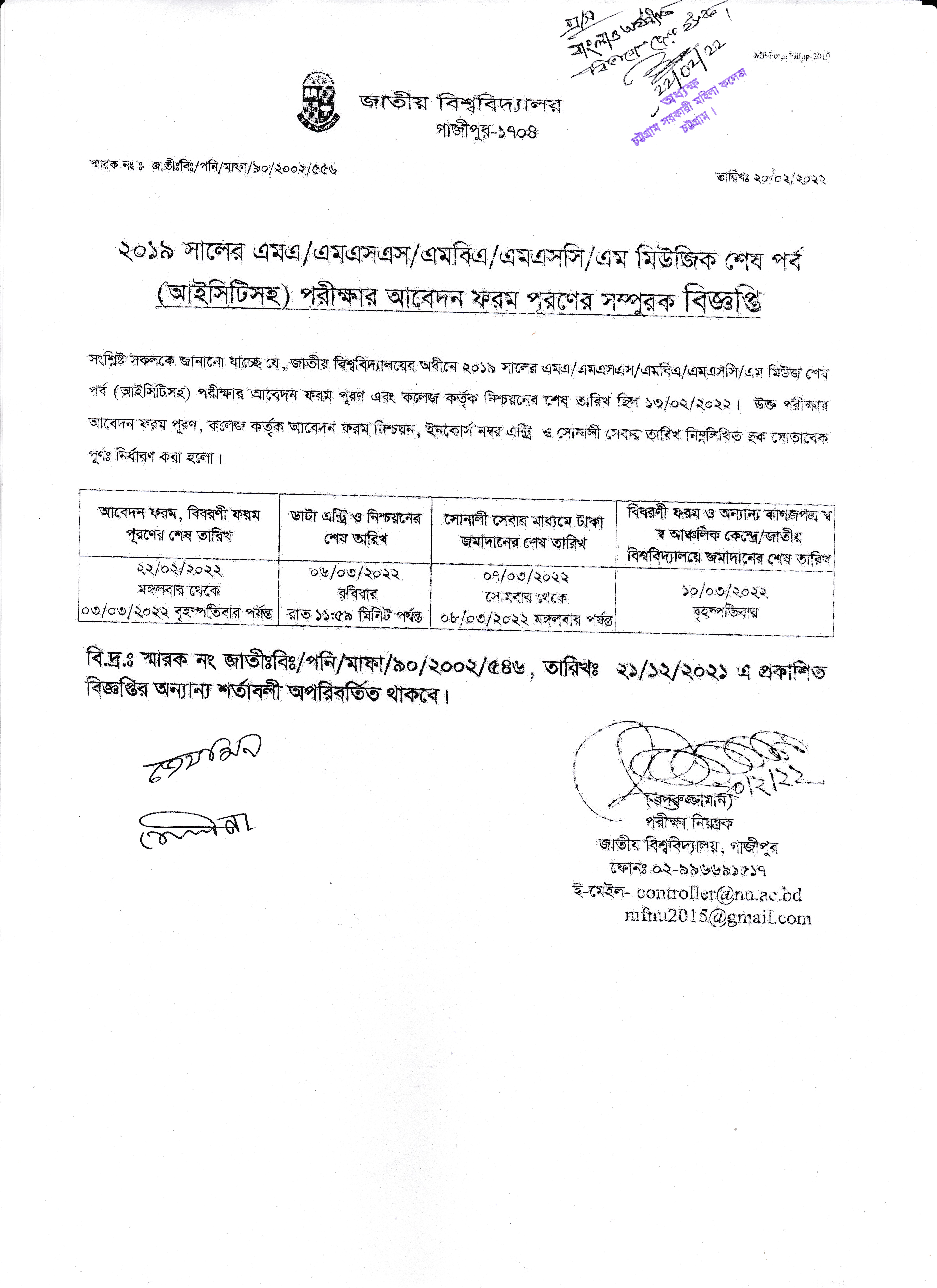 ২০১৯ সালের মাস্টার্স শেষপর্ব পরীক্ষার ফরম পূরণ সংক্রান্ত সম্পূরক বিজ্ঞপ্তি (২৩/০২/২০২২)
