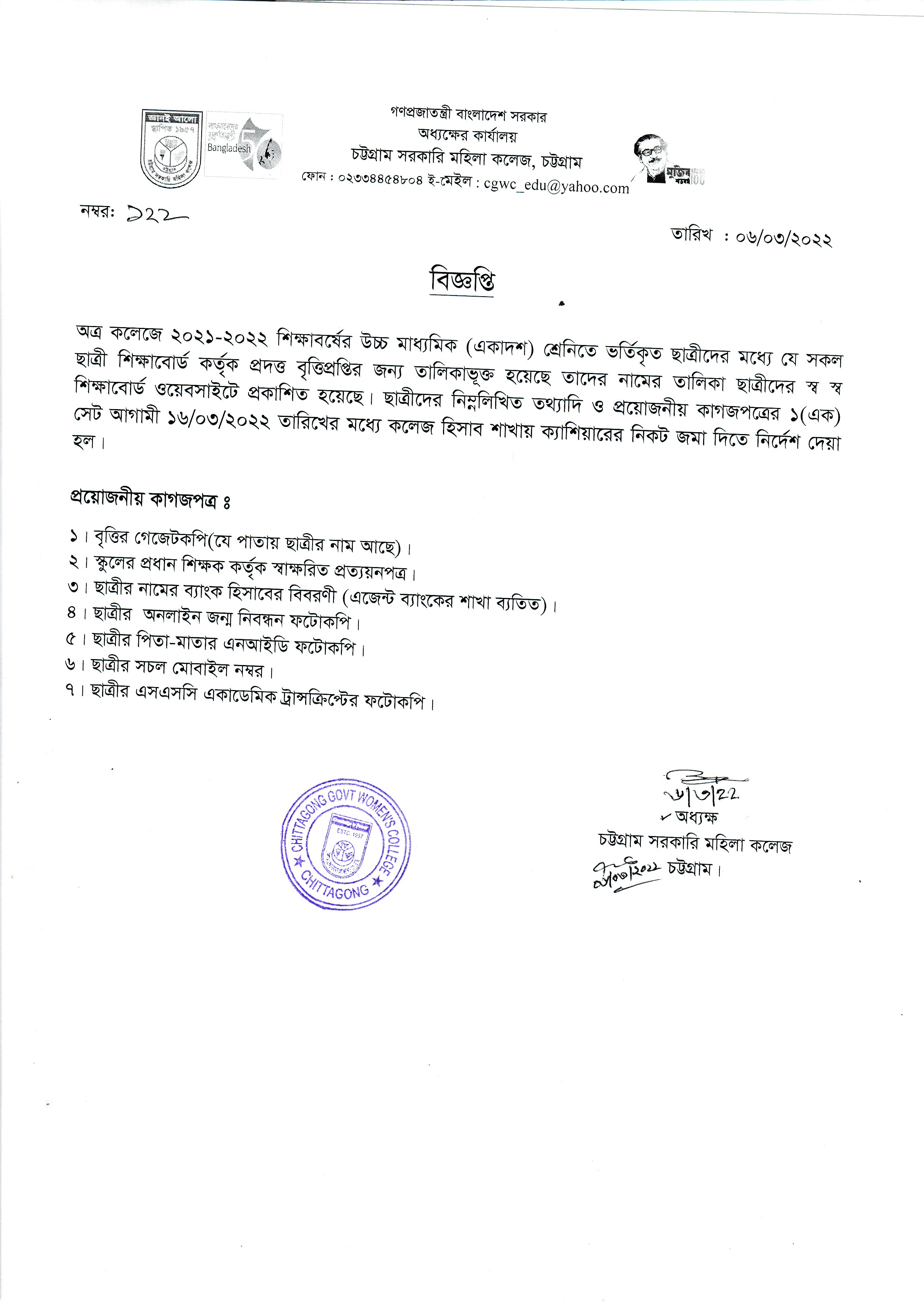 ২০২১-২০২২ শিক্ষাবর্ষে একাদশ শ্রেণিতে ভর্তিকৃত ছাত্রীদের শিক্ষাবৃত্তি সংক্রান্ত বিজ্ঞপ্তি (০৬/০৩/২০২২)