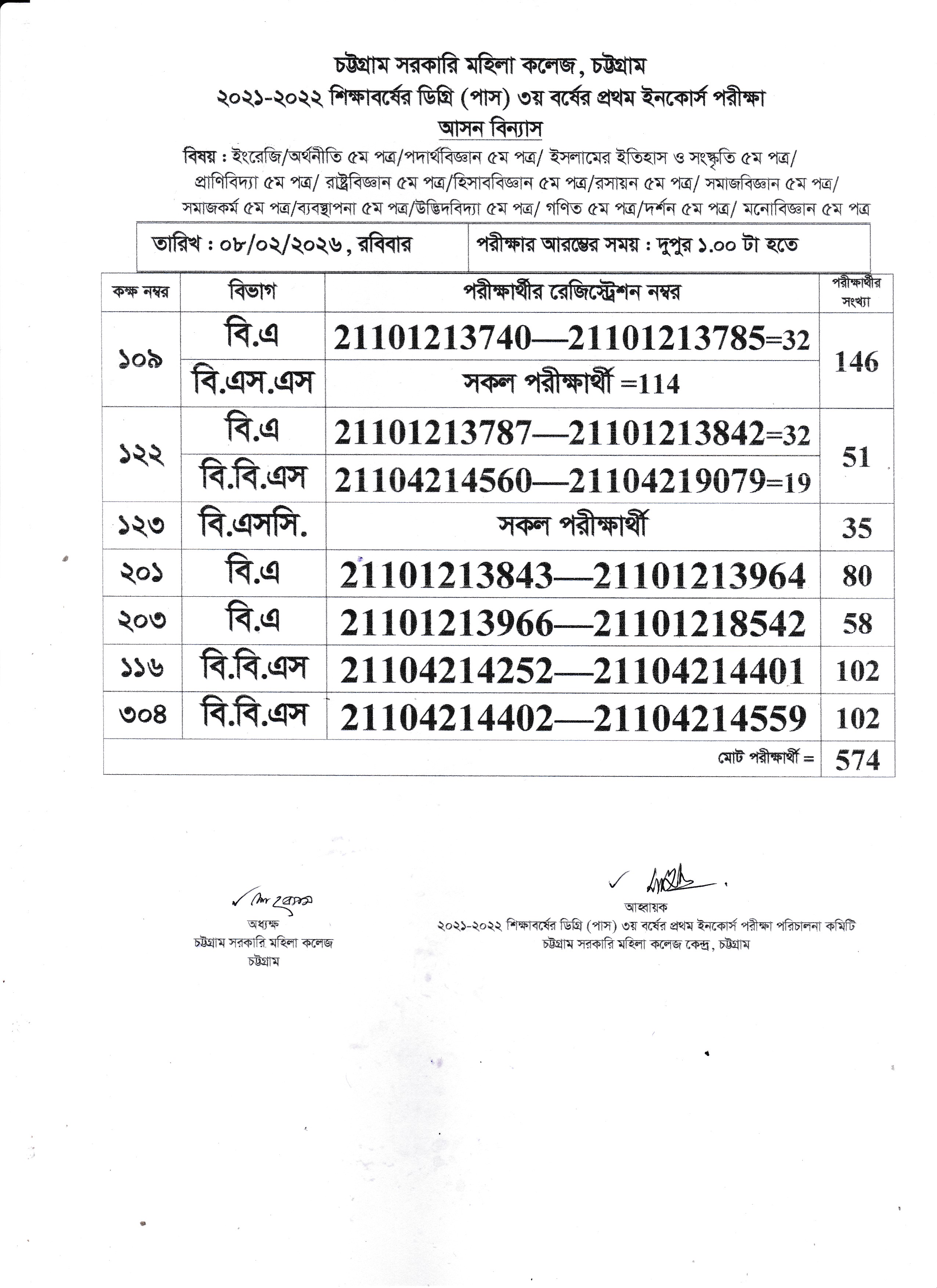 ২০২১-২০২২ শিক্ষাবর্ষের ডিগ্রী (পাস) ৩য় বর্ষের প্রথম ইনকোর্স পরীক্ষার আসন বিন্যাস